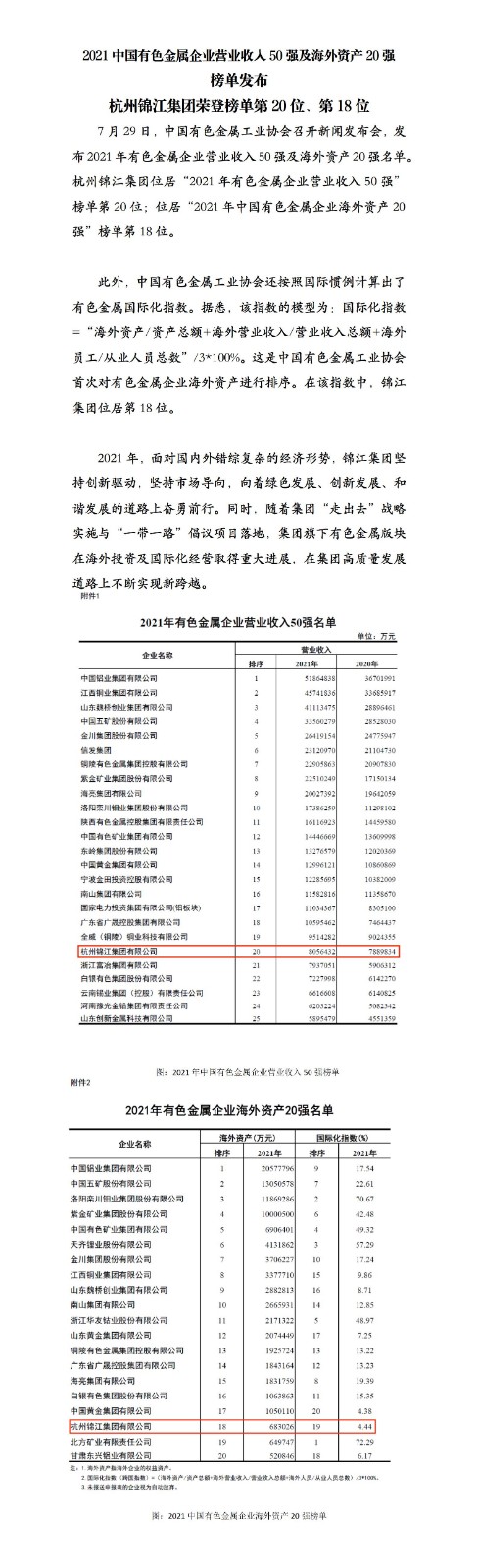 2021中國有色金屬企業(yè)營業(yè)收入50強(qiáng)及海外資產(chǎn)20強(qiáng) 榜單發(fā)布 杭州錦江集團(tuán)榮登榜單第20位、第18位