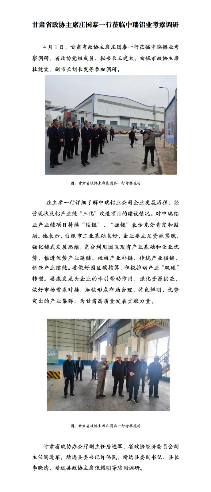 甘肅省政協主席莊國泰一行蒞臨中瑞鋁業考察調研
